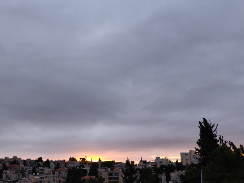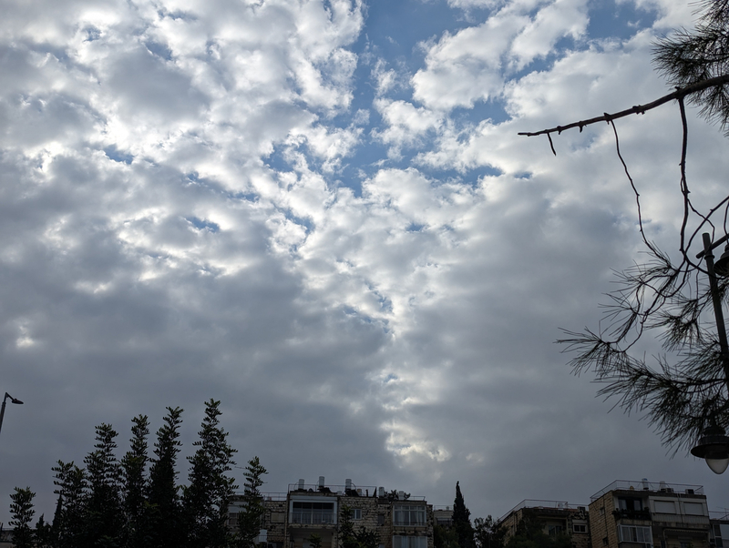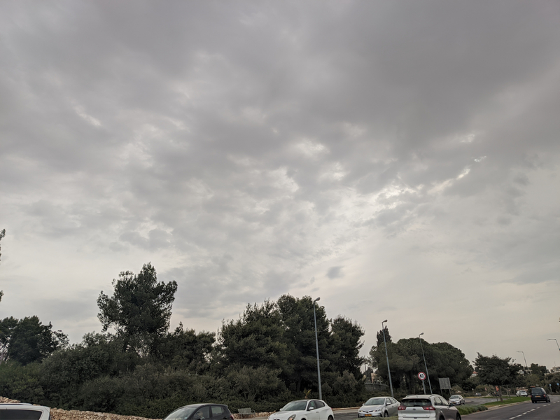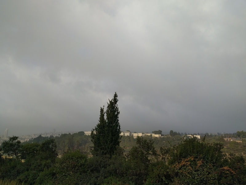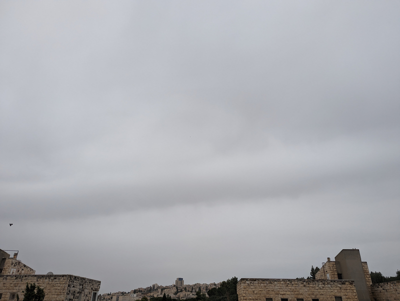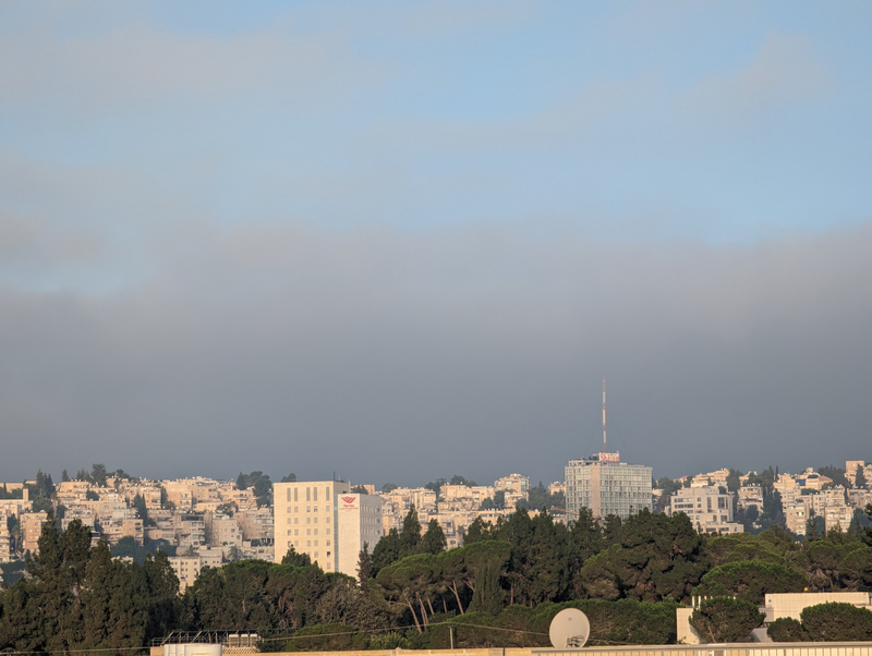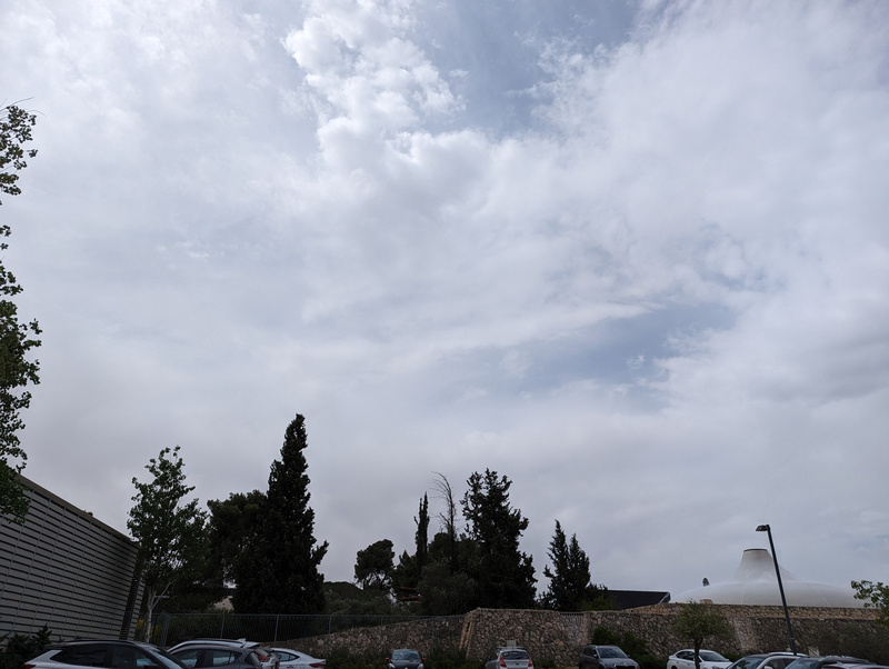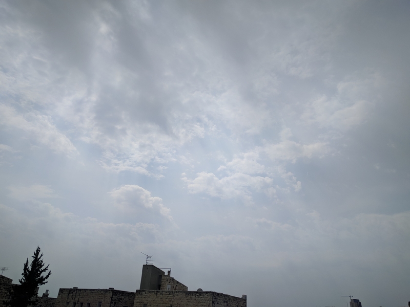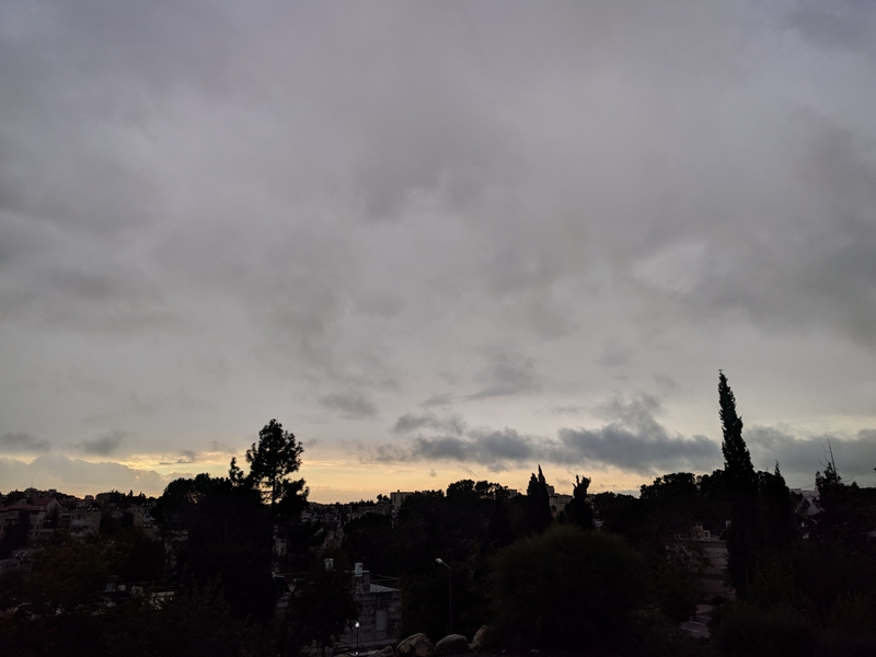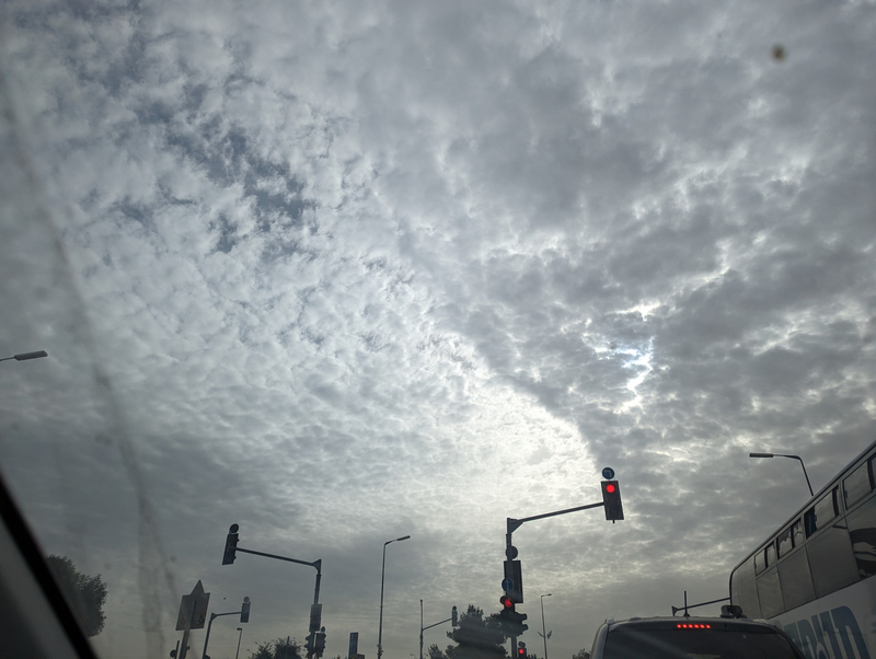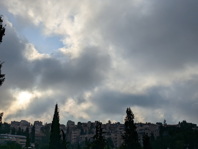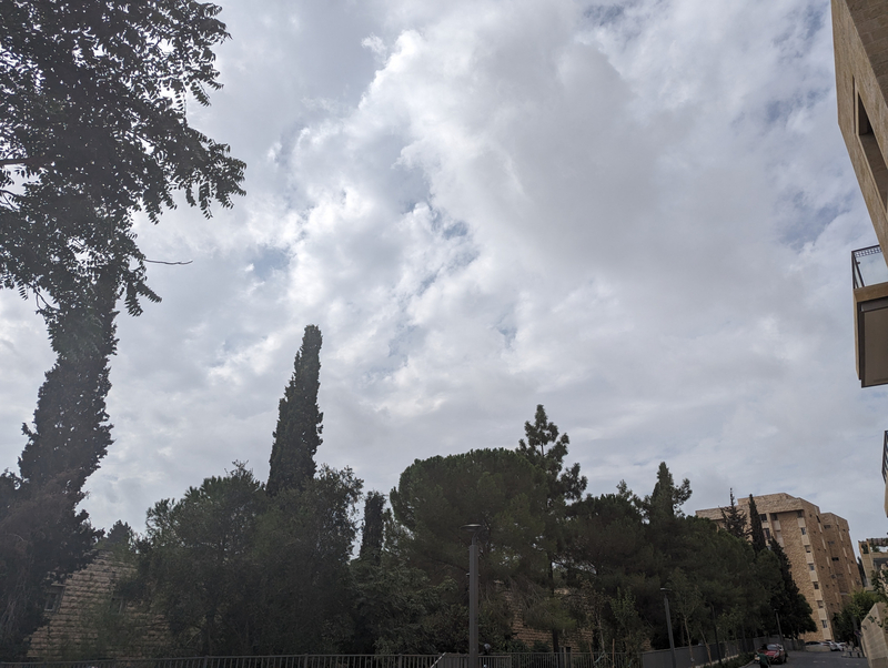 בוקר של עננים סוף סוף, אבל בלי רוח, כך שזה עושה אותו לח בלי רווח, חוץ מהרענון במראה השמיים
