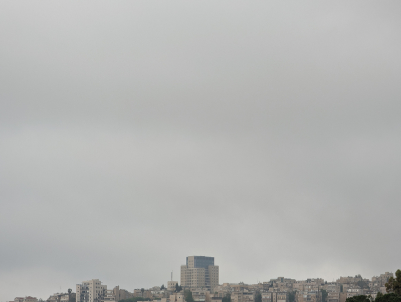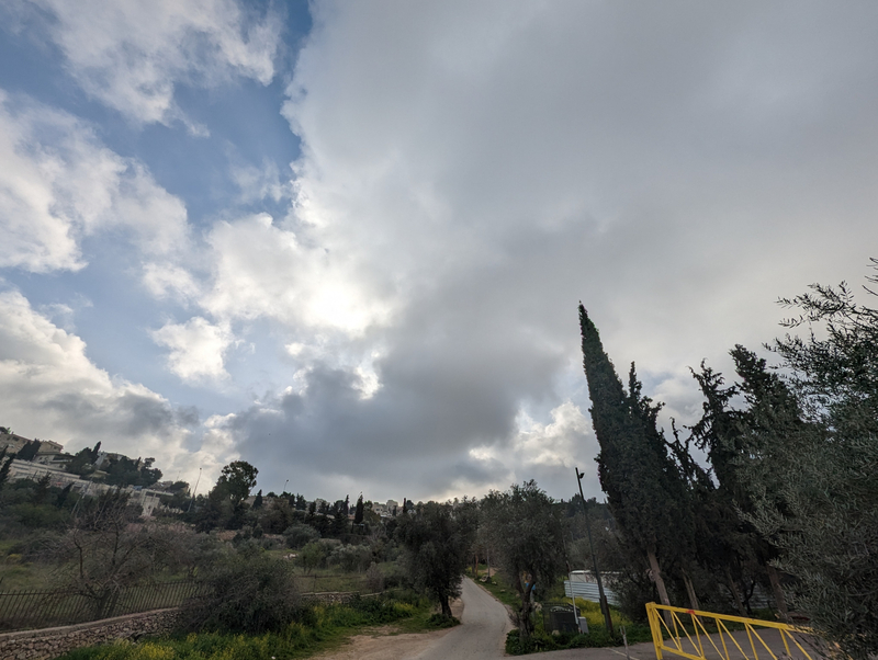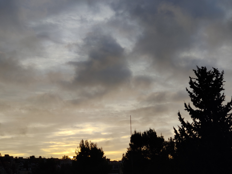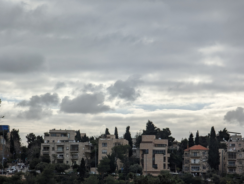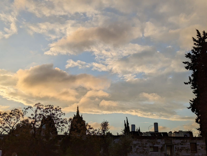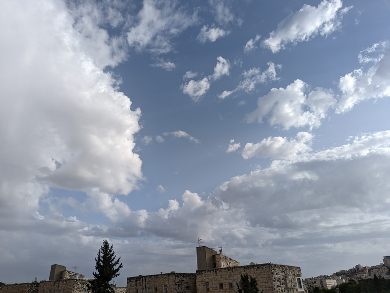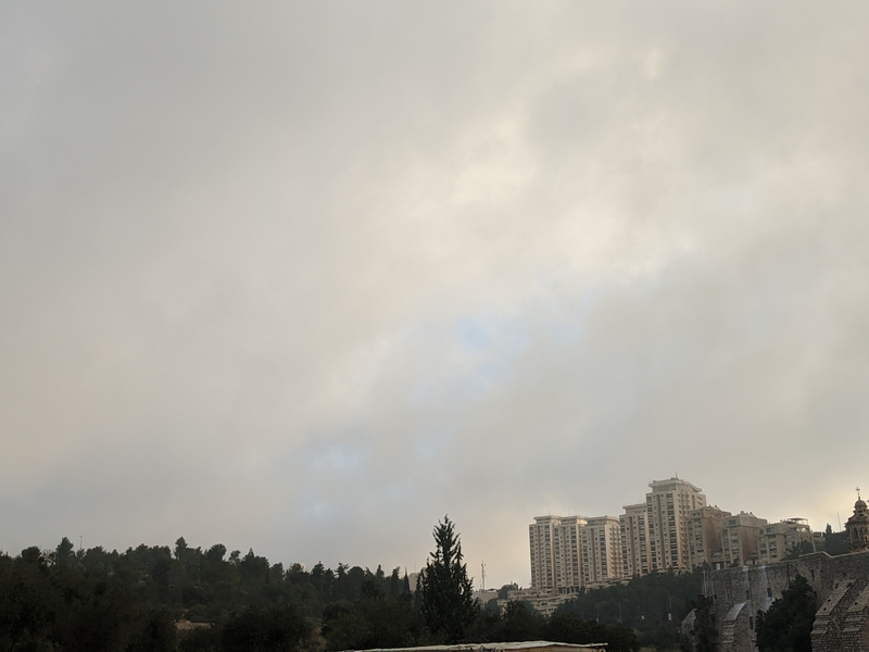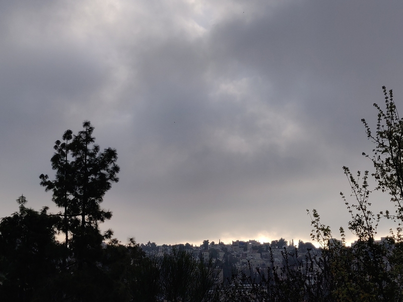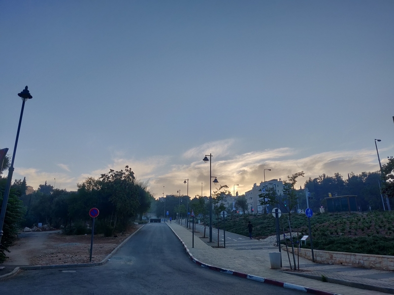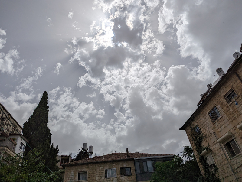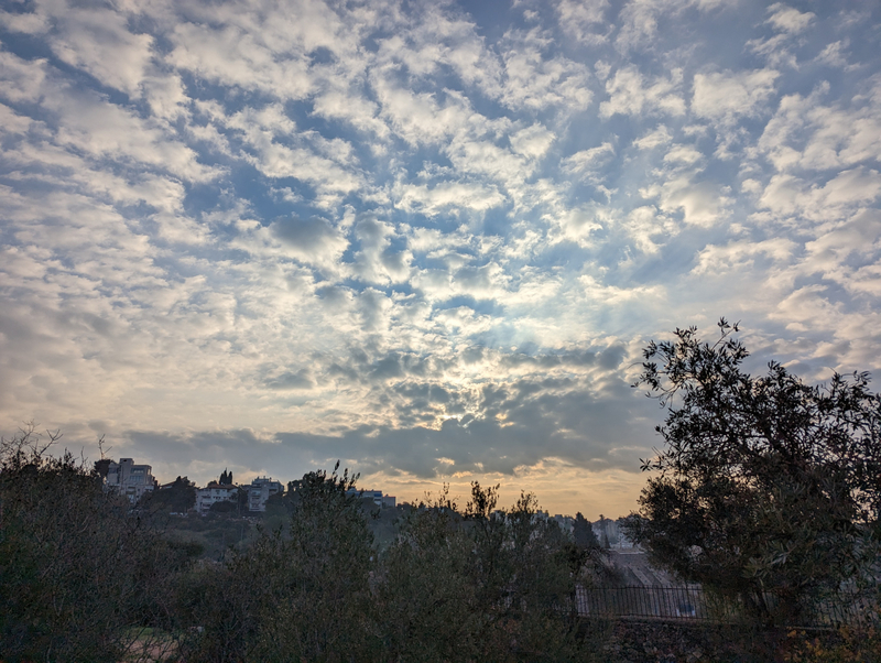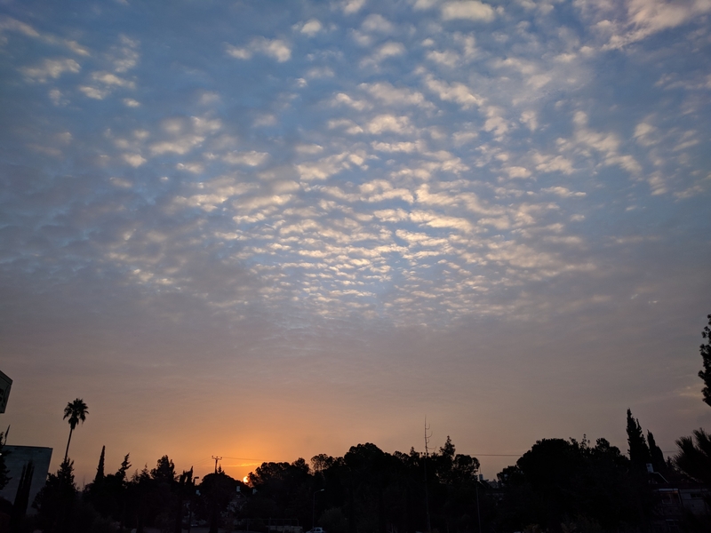 בוקר של עננים סוף סוף, אבל בלי רוח, כך שזה עושה אותו לח בלי רווח, חוץ מהרענון במראה השמיים