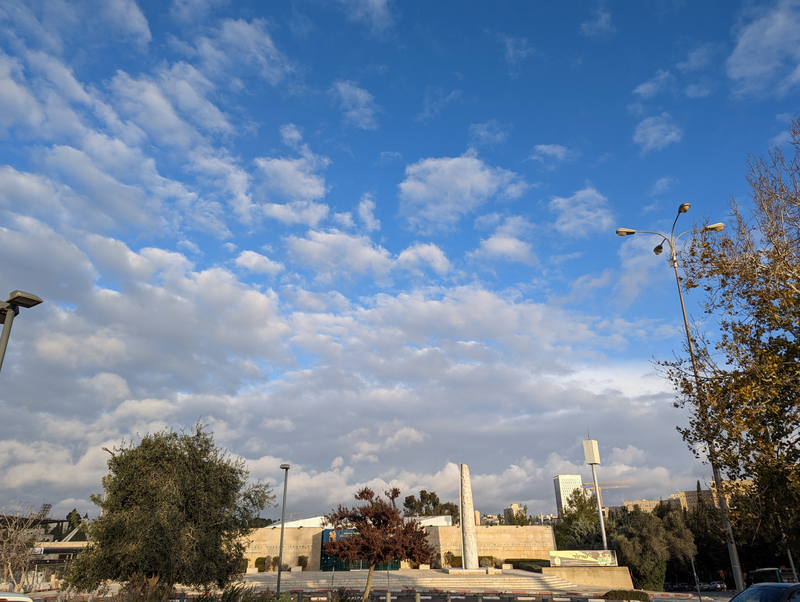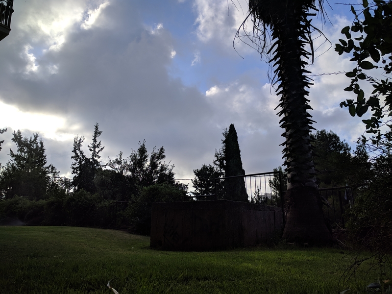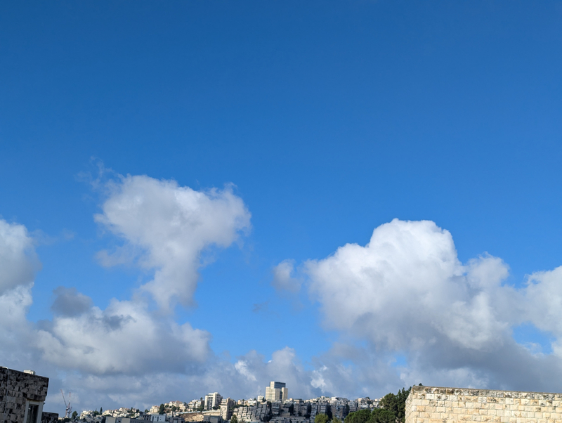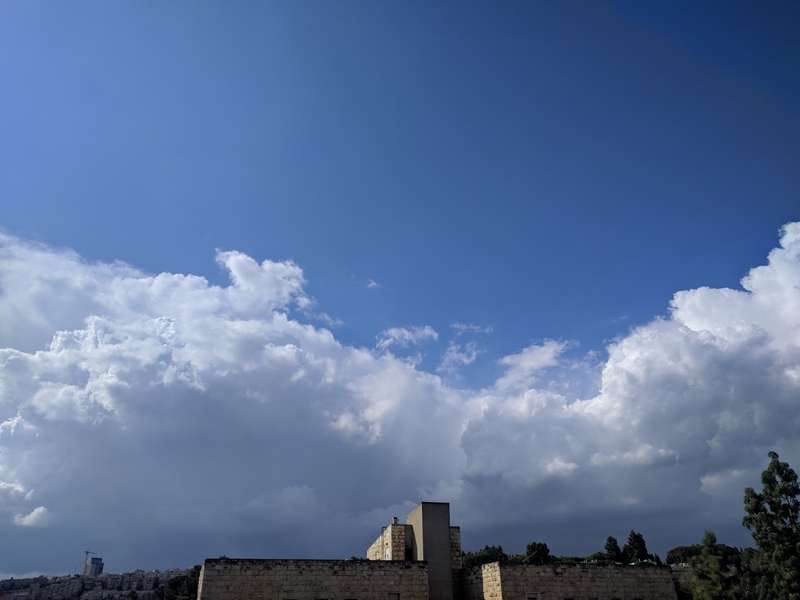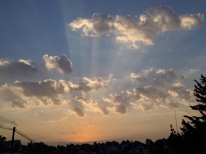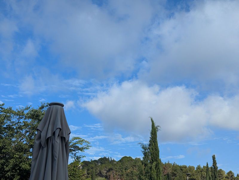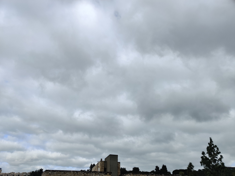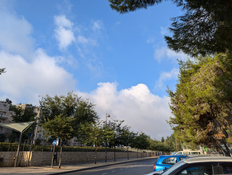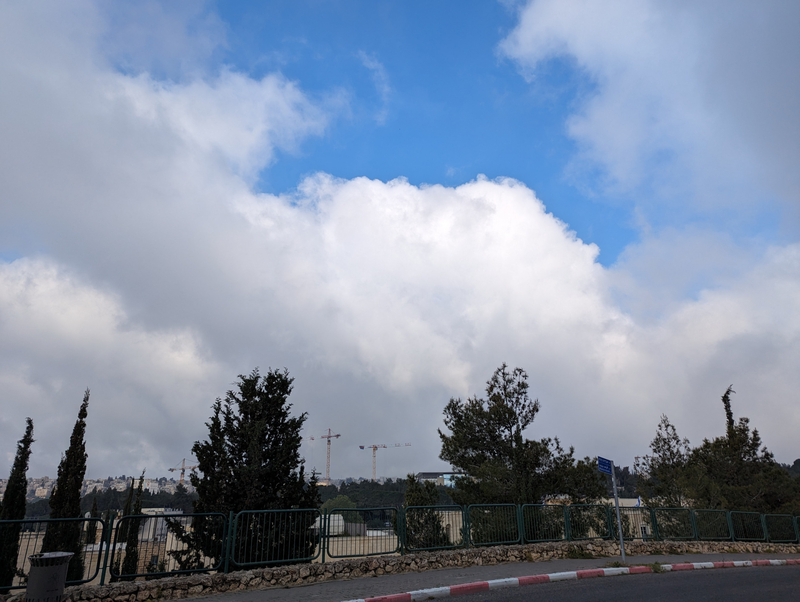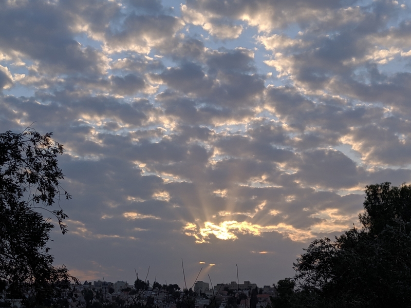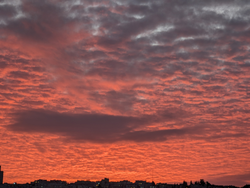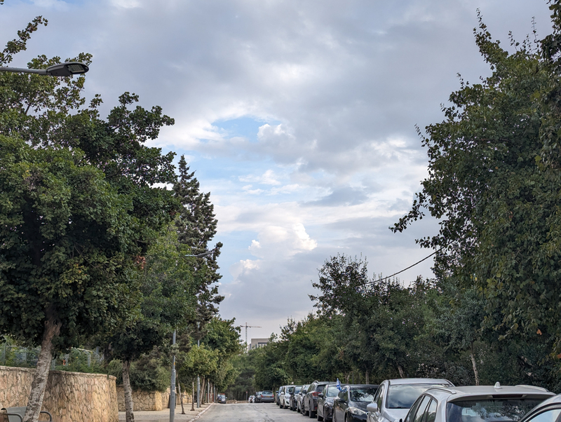 בוקר של עננים סוף סוף, אבל בלי רוח, כך שזה עושה אותו לח בלי רווח, חוץ מהרענון במראה השמיים